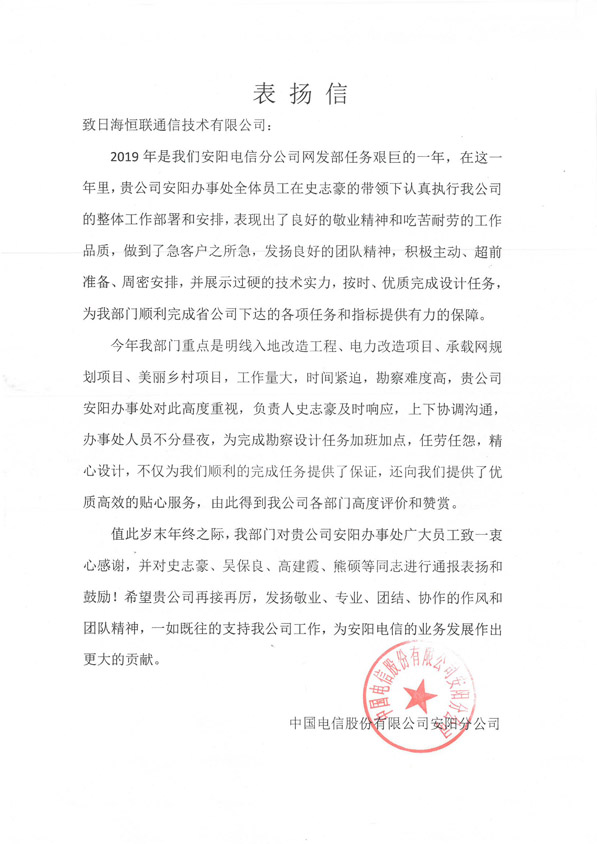 轉(zhuǎn)發(fā)“中國(guó)電信股份有限公司安陽分公司”對(duì)我公司員工的一封表揚(yáng)信