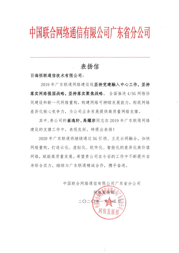 轉發“中國聯合網絡通信有限公司廣東省分公司網絡發展部”對我公司員工的一封表揚信