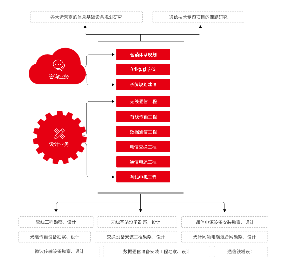 為客戶提供通信網、計算機網、廣播電視網等網絡的設計咨詢服務;為通信企業提供綜合發展規劃、戰略規劃 專題規劃、業務咨詢及管理咨詢等咨詢服務。公司擁有工程設計、工程勘察等國內通信設計領域的頂級資質;優質的服務質量,快速的業務響應能力、標準化、規范化的服務流程以及優秀的工程設計項目質量為公司在業界取得良好的口碑。
